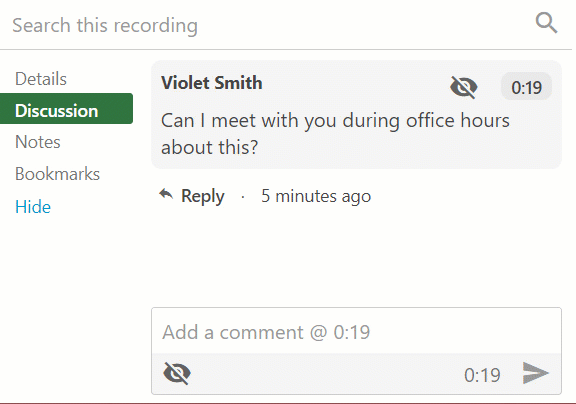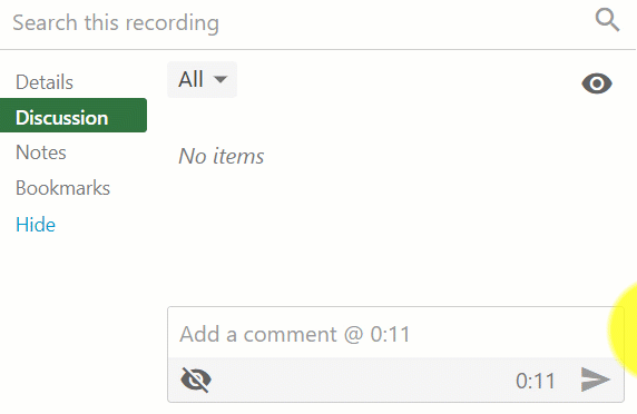 1. Discussions: Viewers can add comments, start discussions, and reply to each other in the Panopto recording's discussion tab. To create a post, type the desired comment in the window and click the post icon in the lower right corner of the panel.